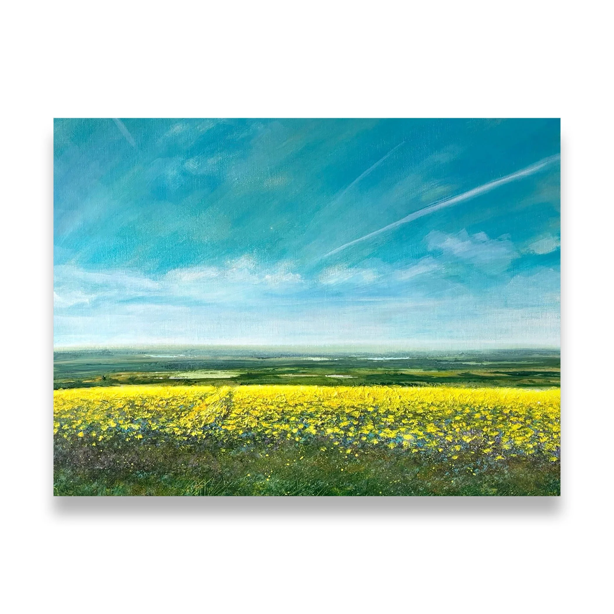 A dreamy place waits us. Filled with blossoms and blooms, petals and sunlight through the trees above our heads. Created organically from imagination the piece evolved to look like a beautiful hill with colourful blossoms, balanced beautifully with gentle pastel colours. Subtle surface textures bring the blossoms to life. Arrives with edges painted white, ready to hang and enjoy. These longer length pieces look particularly beautiful hung above the bed or sofa.