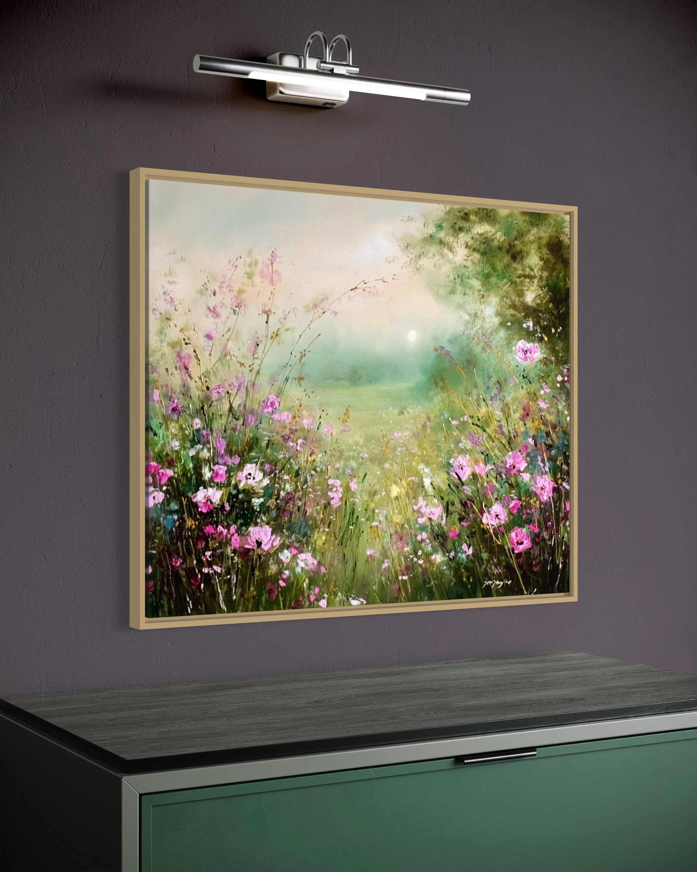 A world of shimmering moonlight awaits, shining across a twilight lake and like diamonds through the trees. Not only a painting, a portal into Nature's wonderous garden. Created from memory and imagination, yet from memories of walking and hiking through the secret gardens in Northumberland. I regularly find secret lakes and rivers in the middle of forests. Expressive and gently textural, this captivating piece makes for a stunning centre piece to your space. Painted in a palette of cool soothing blues, with gently warm yellows and greens. Gentle Gold stems and flowers, will catch the light, shimmering once hung in the changing light of the day. Wildflowers like small Bluebells are gently illuminated across the shadows in the foreground. Makes for a stunning centre-piece for your space. Beautiful to enjoy all year round, in both bedroom and main living areas.